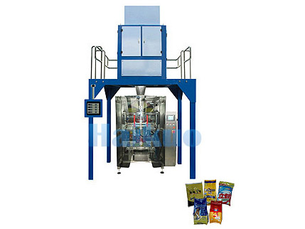 該機是由一臺立式充填包裝機,稱量機和垂直斗式提升機組成,集稱量,制袋,折邊,充填,封口,打印,沖孔,計數(shù)于一體,采用伺服電機同步帶拉膜,具有自動糾偏功能。PLC控制元器件均采用國際名牌產(chǎn)品,性能可靠。橫封豎封采用氣動,動作平穩(wěn)可靠。先進的設(shè)計保證了該機調(diào)整,操作,維修均十分方便。