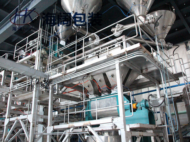 原料包輸送―→向各原料倉口投料―→按配方電腦配料(電子稱重)―→自動卸料―→自動提升―→自動混合均勻―→自動卸料至定量包裝機料倉(料位自動控制)--→自動稱重計量―→自動充填―→輸送―→內袋熱封口―→外袋縫包