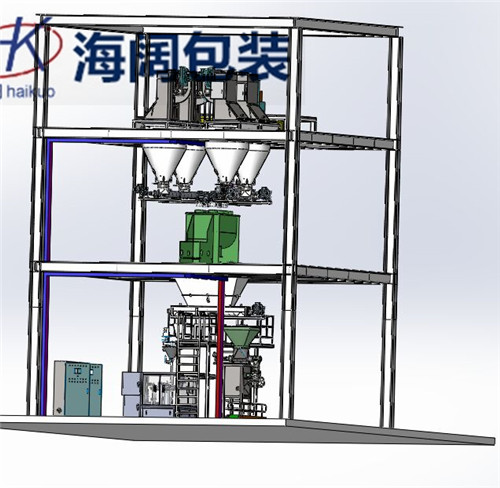 人工平臺(tái)拆包、直接投料至混合機(jī)(混合機(jī)帶開(kāi)袋站及除塵)―→自動(dòng)混合均勻―→自動(dòng)卸料至定量包裝機(jī)料倉(cāng)(料位自動(dòng)控制)--→人工套袋―→自動(dòng)稱(chēng)重計(jì)量―→自動(dòng)充填―→稱(chēng)好―→自動(dòng)落袋―→輸送―→熱封口(縫包)。