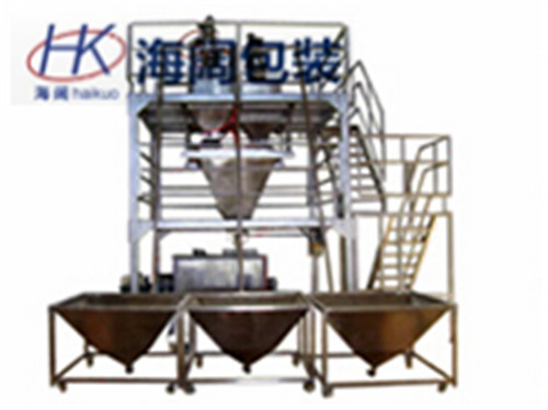 二種或三種原料包上平臺→人工拆包、向各原料倉口投料→按配方自動配料(電子稱重)→配好→自動卸料至爬斗提升機(jī)料斗→自動提升至高位平臺→自動卸料至混合機(jī)→自動混合均勻→自動卸料至定量包裝機(jī)料倉(料位自動控制)→人工套袋→螺旋秤自動稱重計量→自動充填→稱好→自動落袋→輸送→內(nèi)袋熱封口―→外袋縫包。
