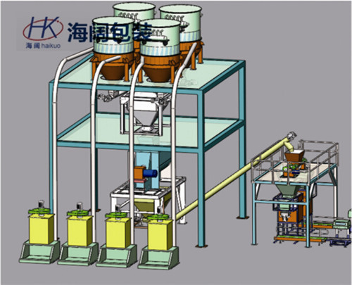 二 種或三種原料包上平臺(tái)→人工拆包、向各原料倉口投料→按配方自動(dòng)配料(電子稱重)→配好→自動(dòng)卸料至爬斗提升機(jī)料斗→自動(dòng)提升至高位平臺(tái)→自動(dòng)卸料至混合 機(jī)→自動(dòng)混合均勻→自動(dòng)卸料至定量包裝機(jī)料倉(料位自動(dòng)控制)→人工套袋→螺旋秤自動(dòng)稱重計(jì)量→自動(dòng)充填→稱好→自動(dòng)落袋→輸送→內(nèi)袋熱封口―→外袋縫包。